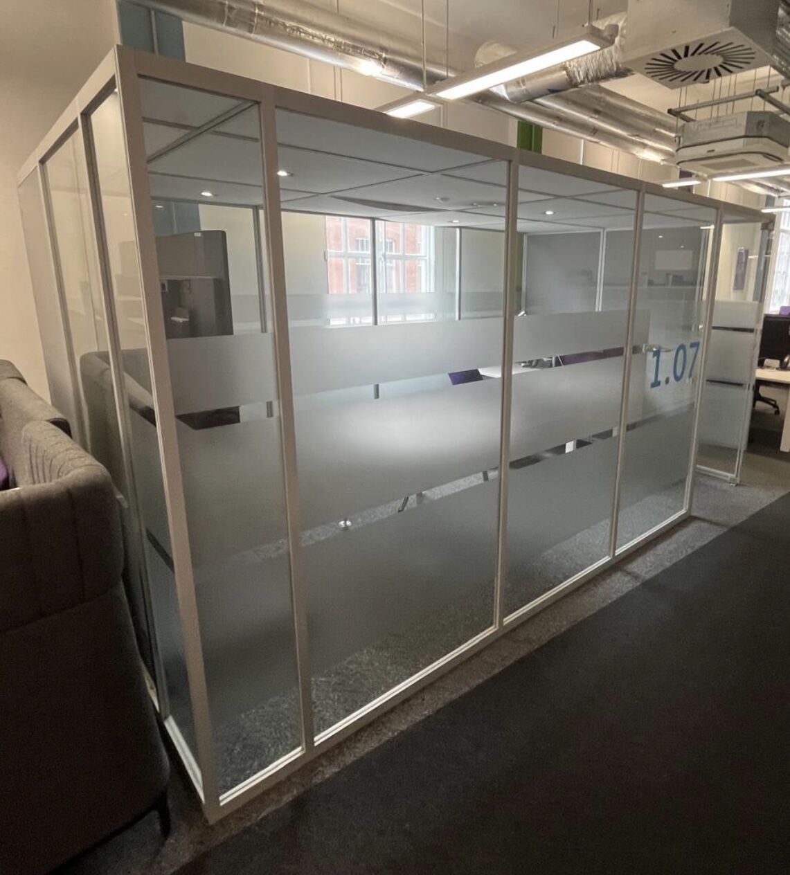 Boss Design Modular Work Space 4.3M x 2.5M Glazed with Safety Manifestation on Alloy Frame, Acoustic Modular Workspace Dimensions