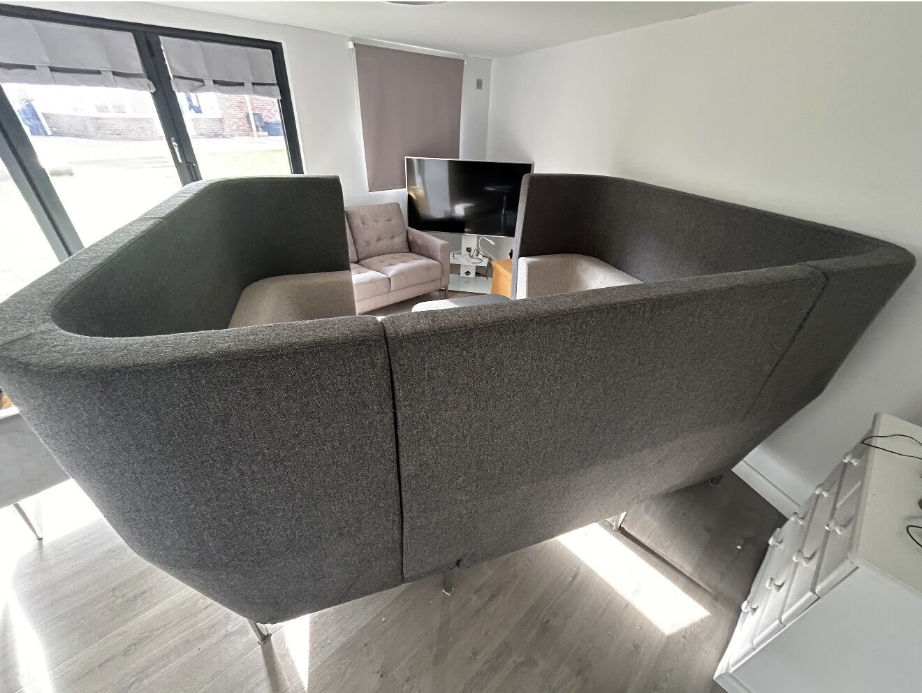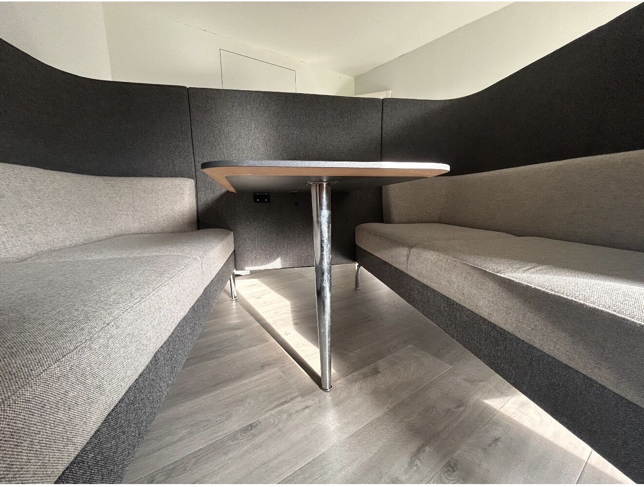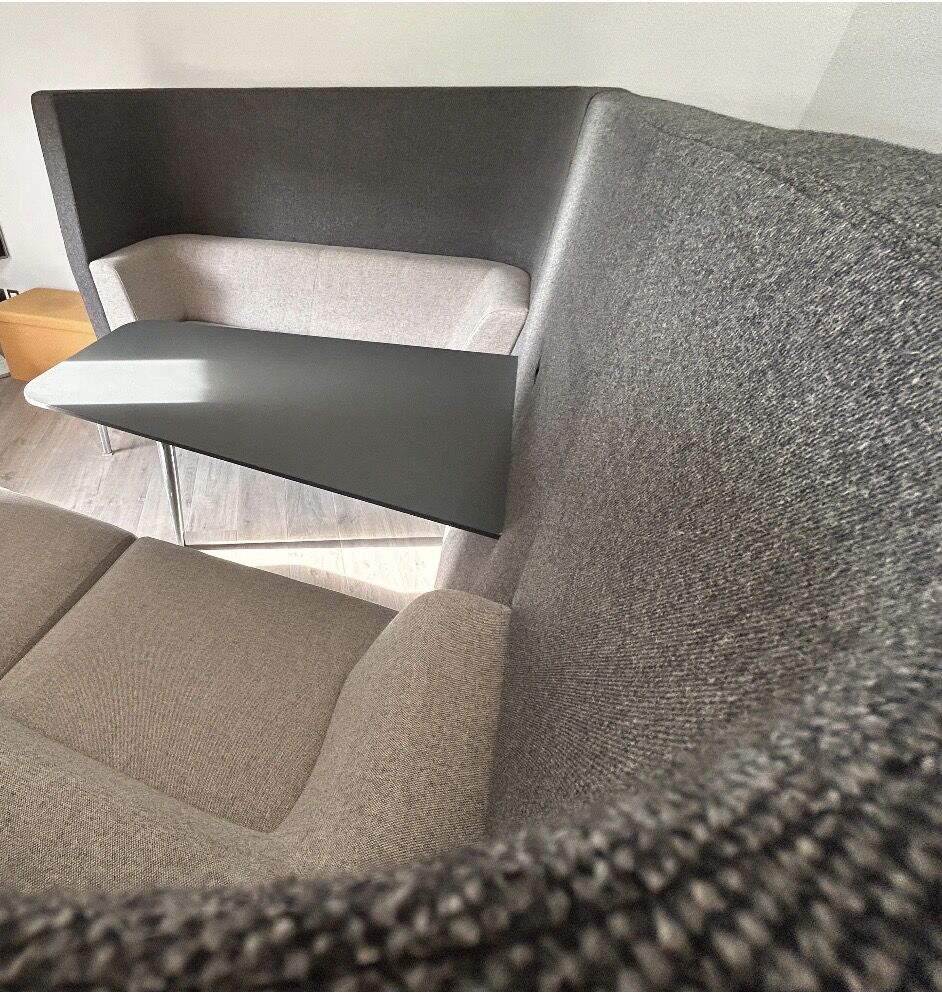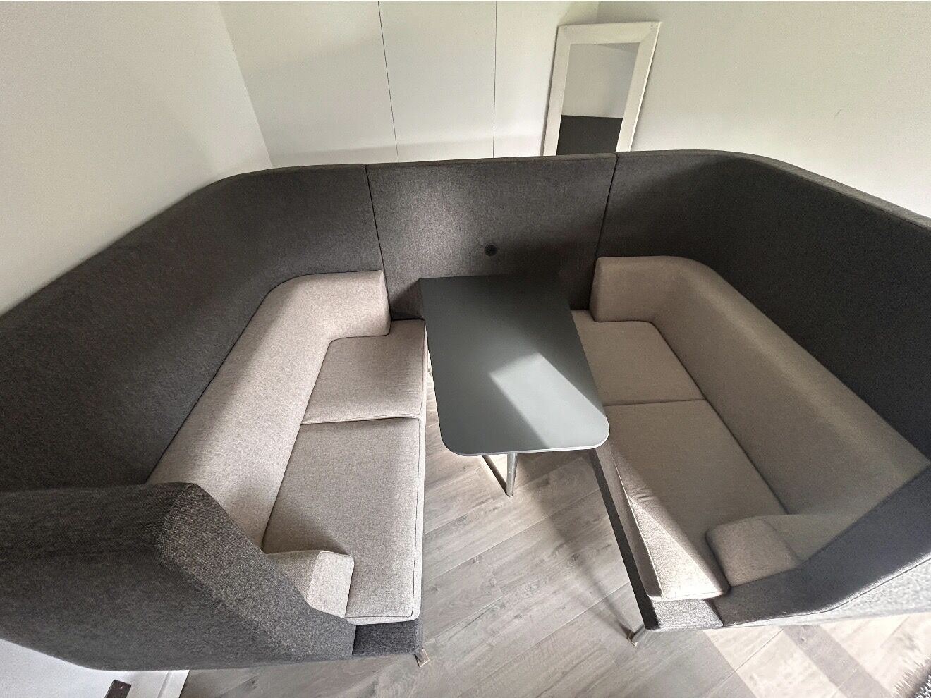 It comprises two high-back sofas surrounding the table then wrapped in an elegant interconnecting panel