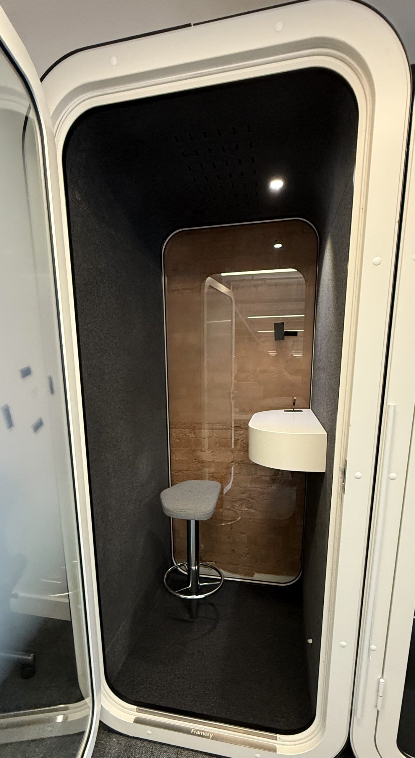 The speech level reduction (DS,A) of Framery O is 30 dB measured according to ISO 23351-1. Pods with this level of sound insulation can be placed right next to workstations in an office and people working outside them will not be able to overhear discussions inside.