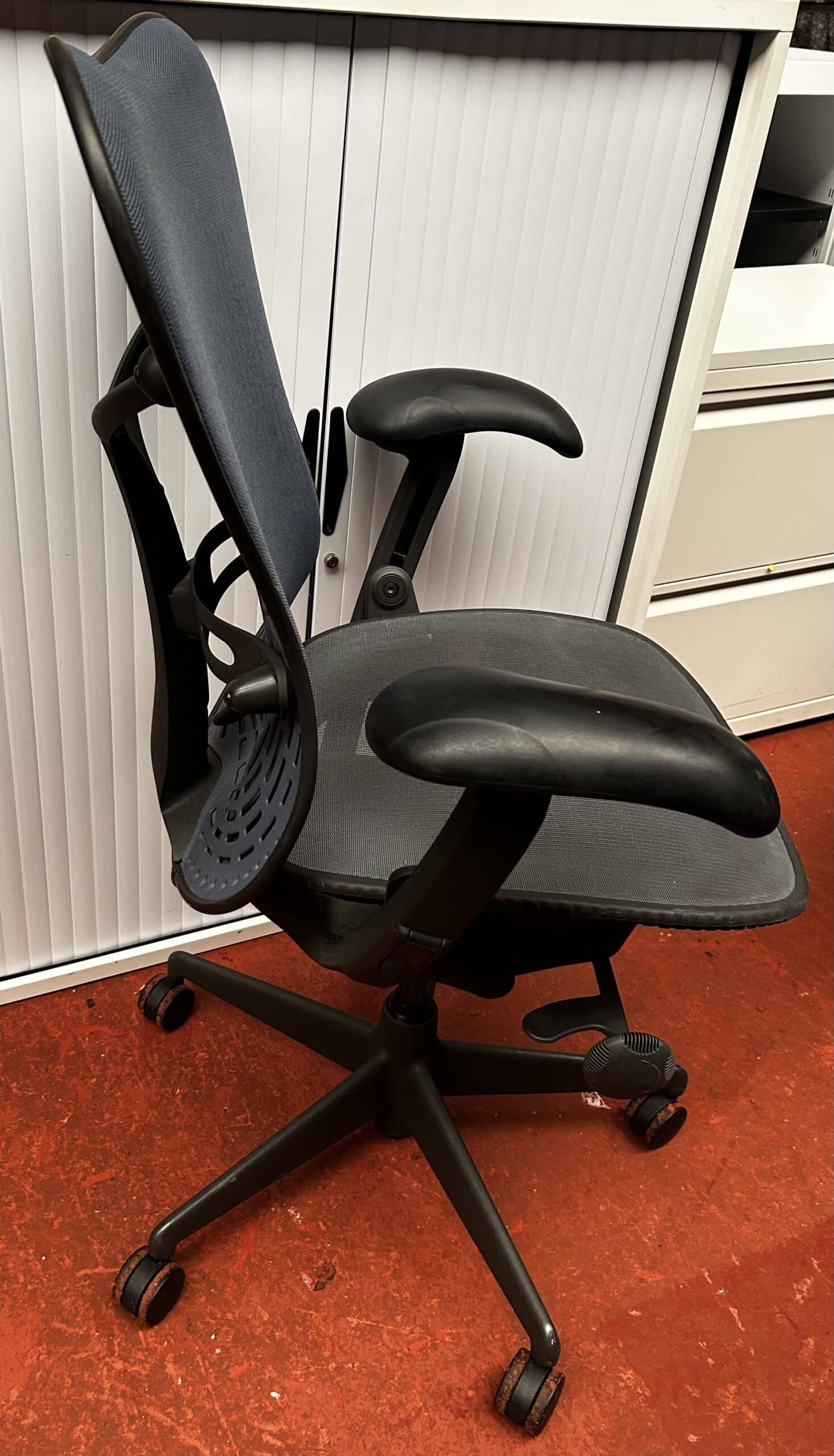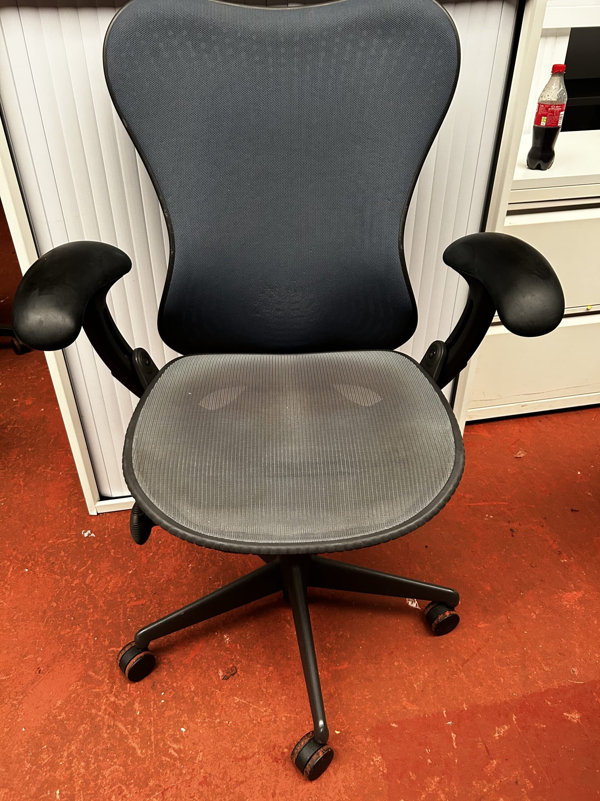 Home / List of used office chairs by cost / Used Office Chairs Between £250 & £500 / Herman Miller Mirra v1 in blue with butterfly backrest Seat extender and forward tilt