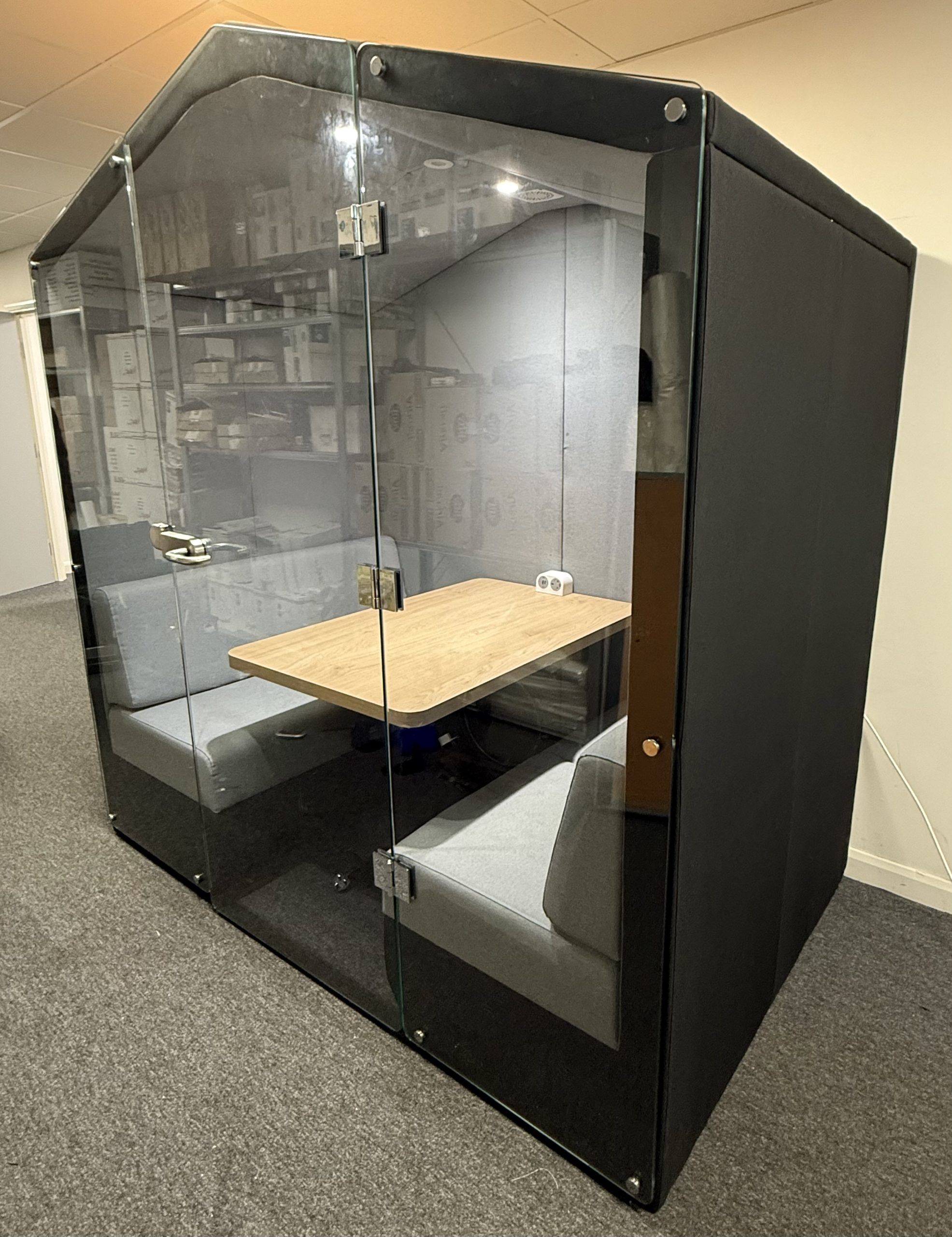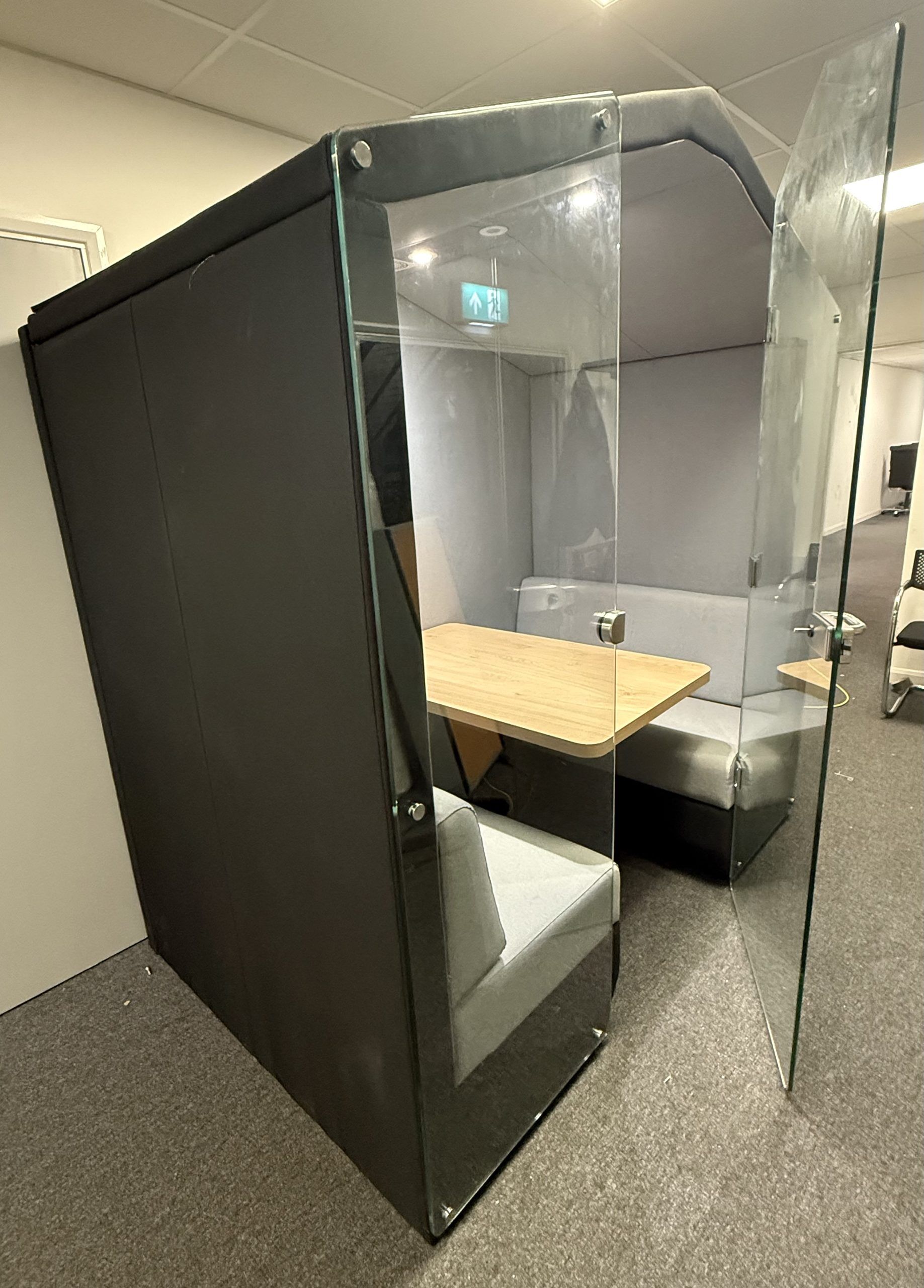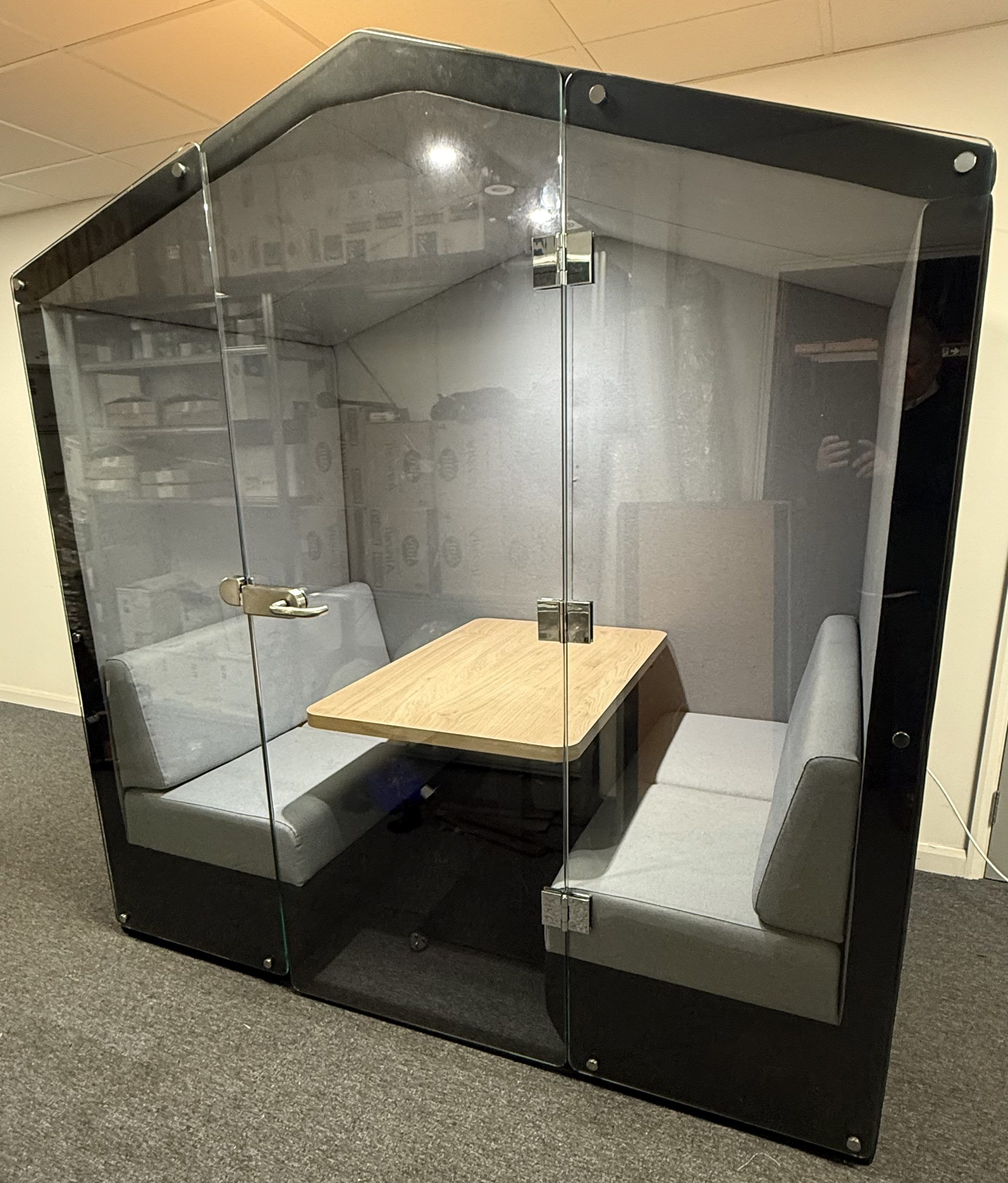 Bea is a fully upholstered office booth with a pitched roof and floor.