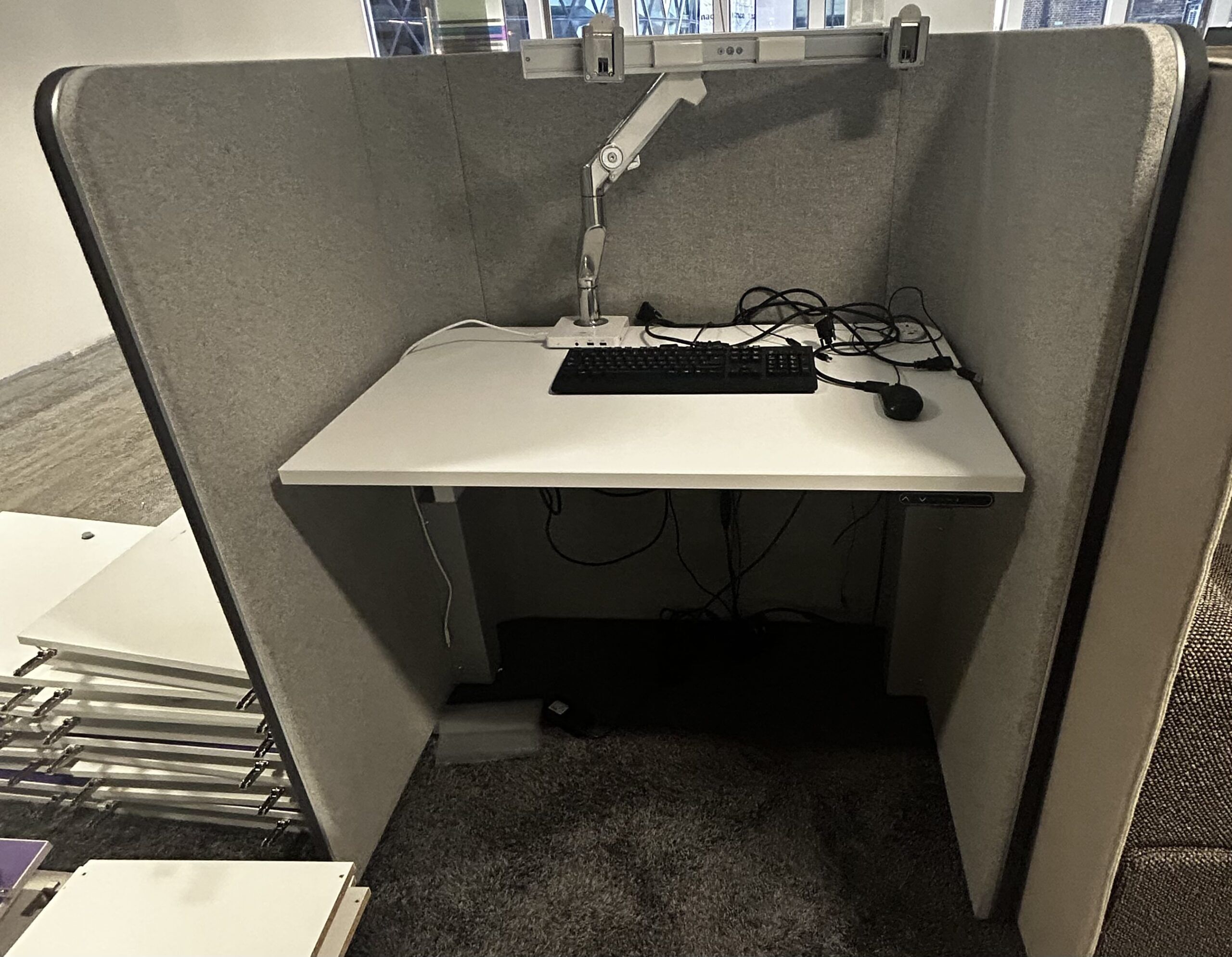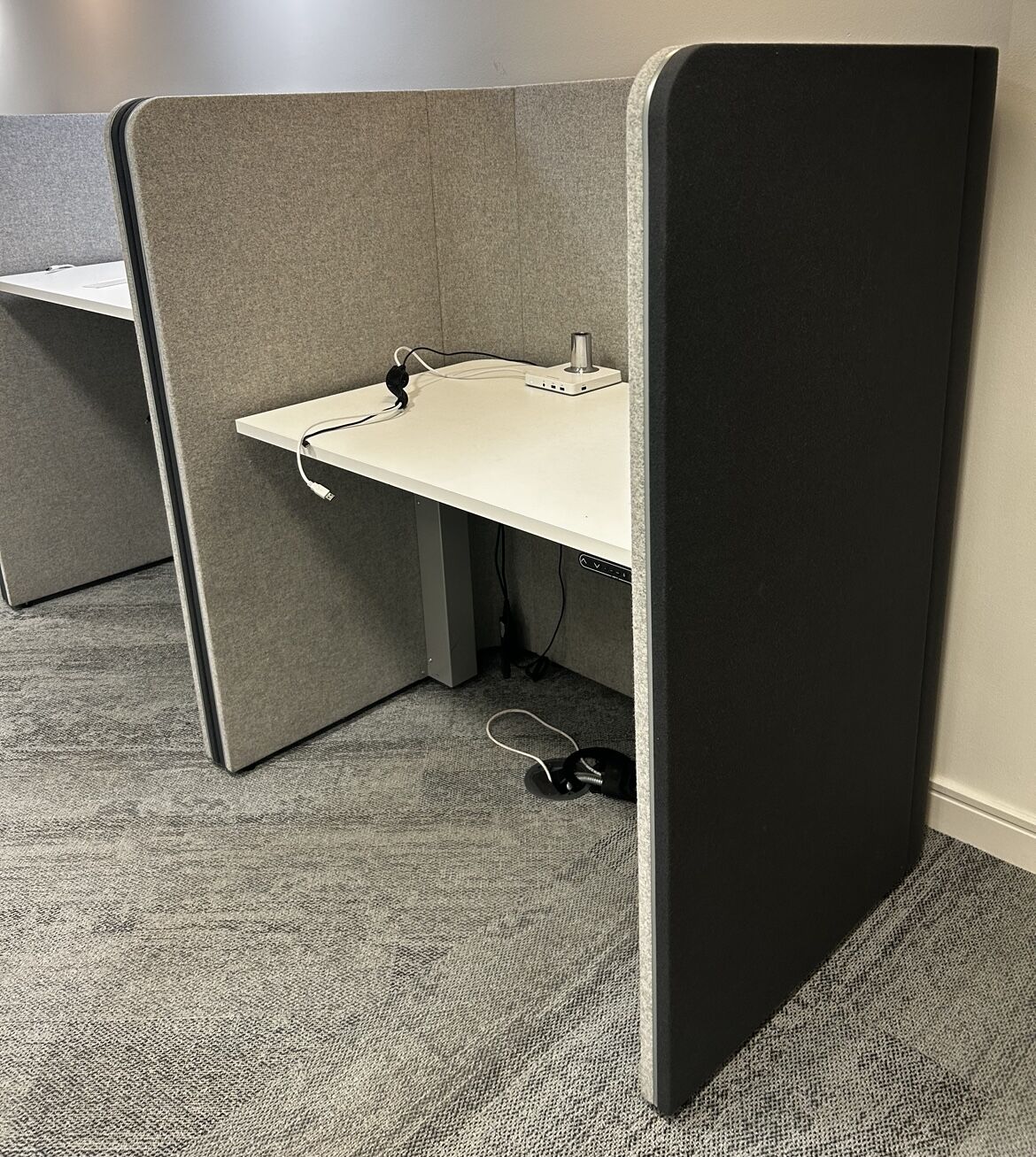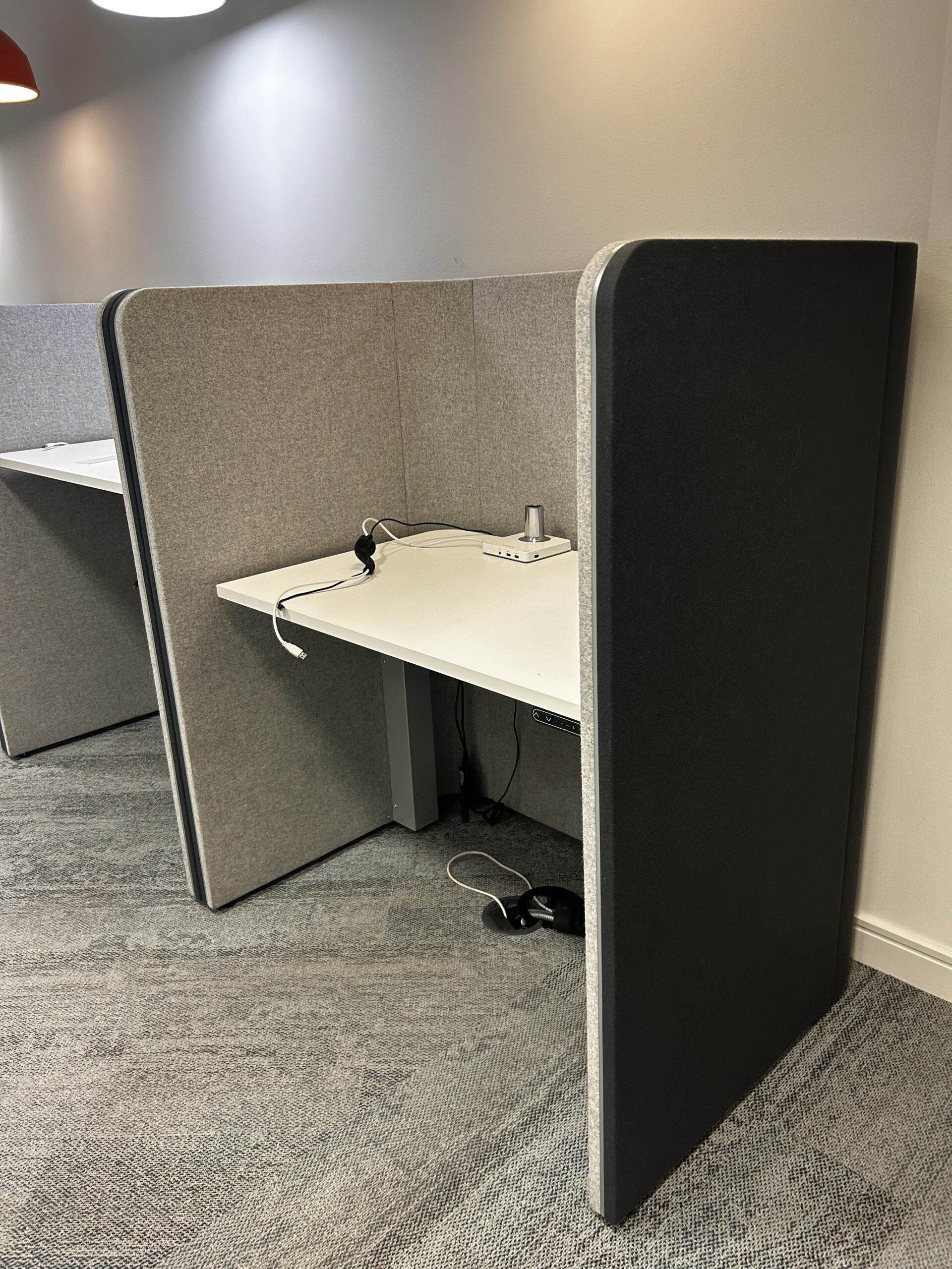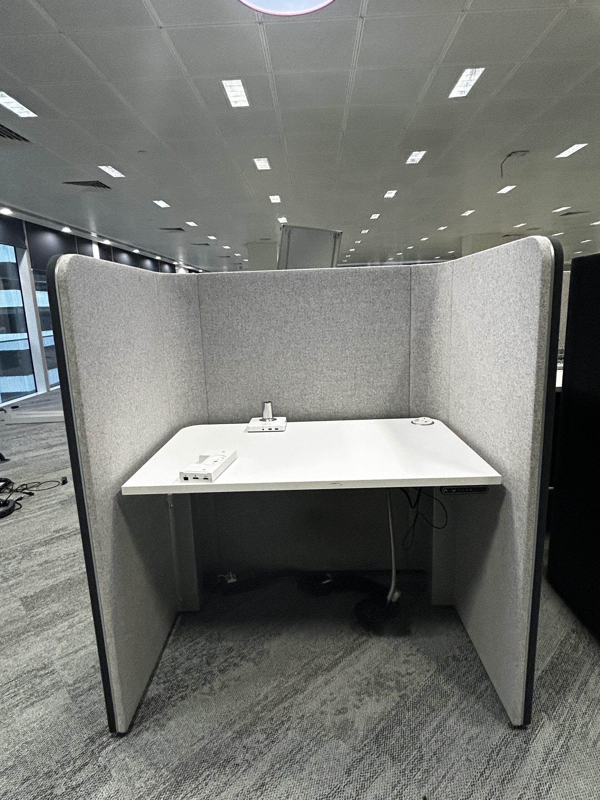 These Ocee Design Den booths have power-assisted sit-stand desktops where the worktops can be positioned to suit your working style.