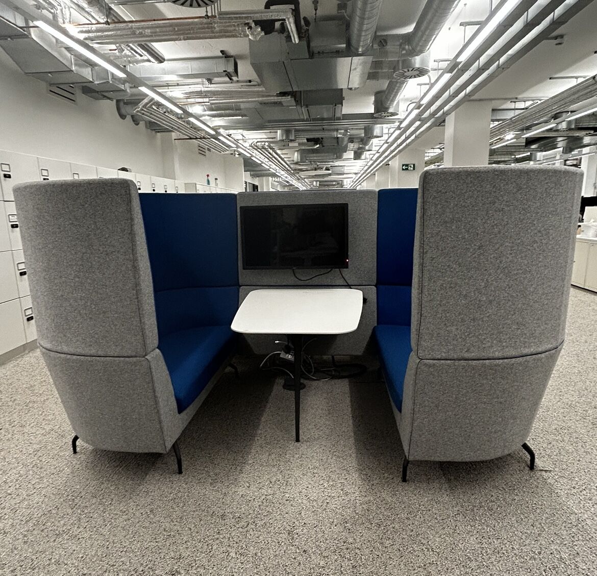 The Orangebox Cwtch Meeting booth can seat four people comfortably and it is ideal for any open breakout or reception areas.