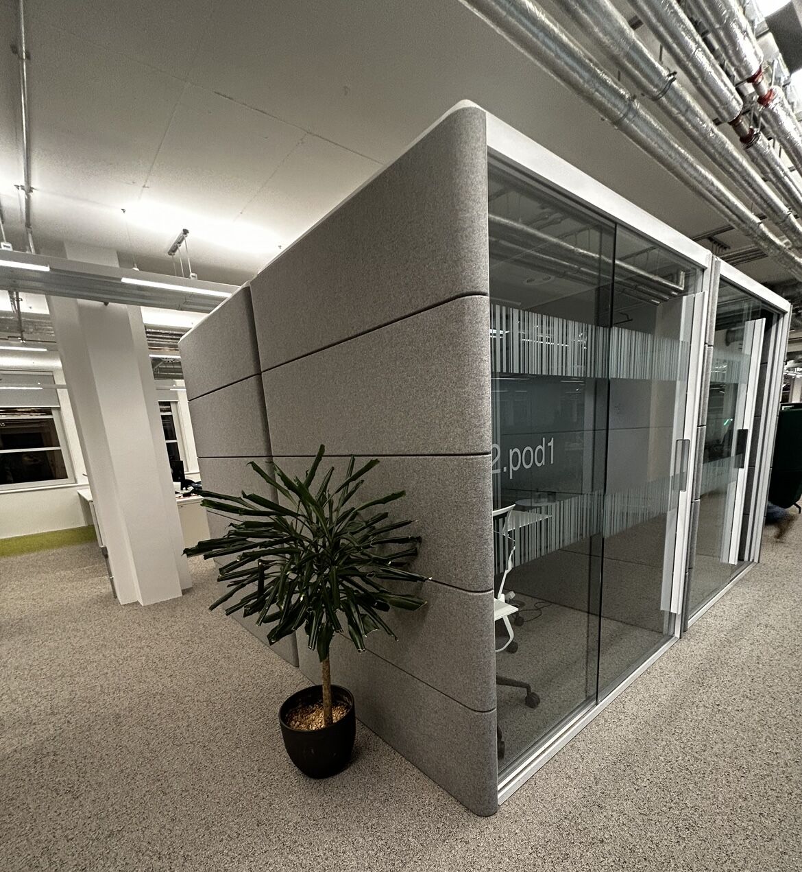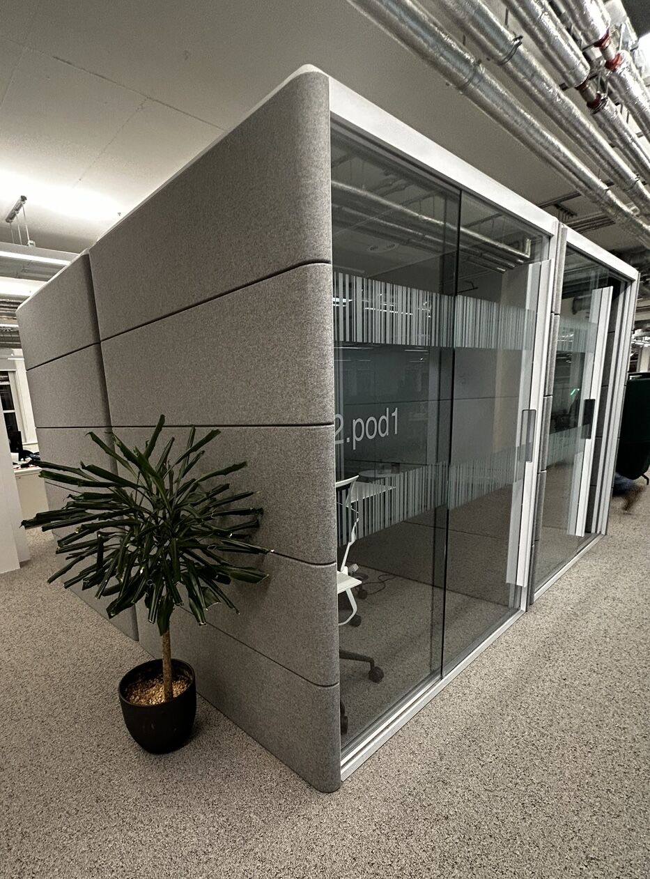 Can be used as single person private workspace with a desk and task chair or, alternatively, without a desk it can also be used as a double team member conference area with a table and two soft seats