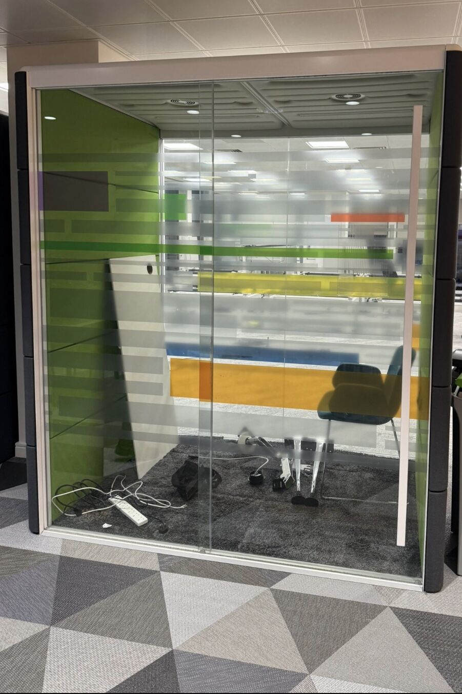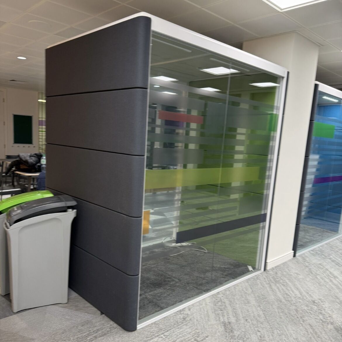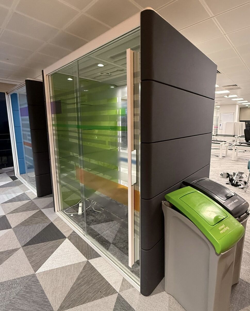Can be used as single-person private workspace with a desk and task chair or, alternatively, without a desk it can also be used as a double team member conference area with a table and two soft seats.