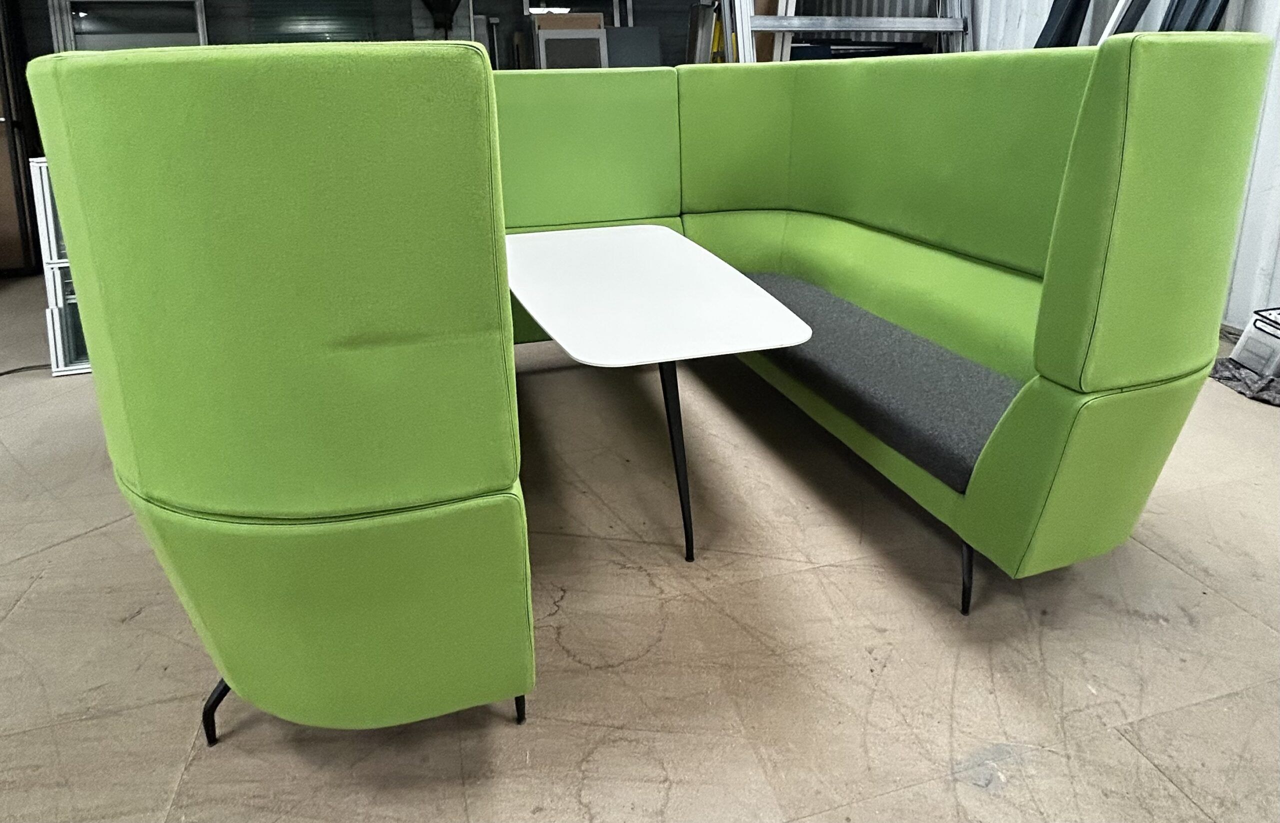 The Orangebox Cwtch Meeting booth can seat six people comfortably and it is ideal for any open breakout or reception areas.