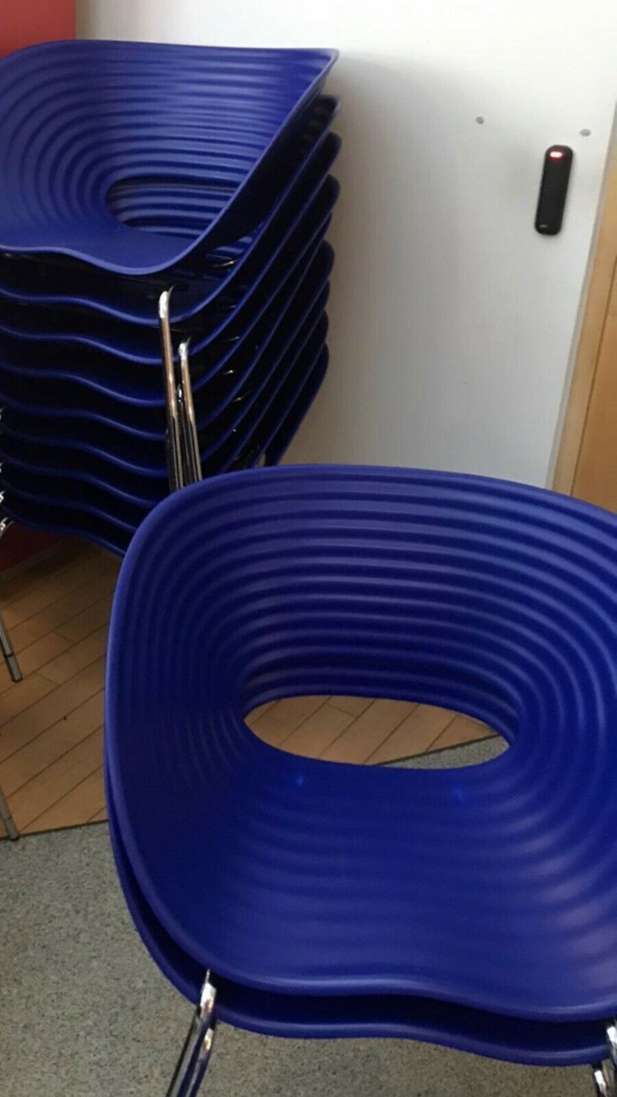 Ron Arad Designed, Tom Vac is an elegantly organic and comfortable chair with a generously proportioned seat. Its corrugated structure provides flexibility and stability and the chair is stackable (up to 5 high) for easy storage.