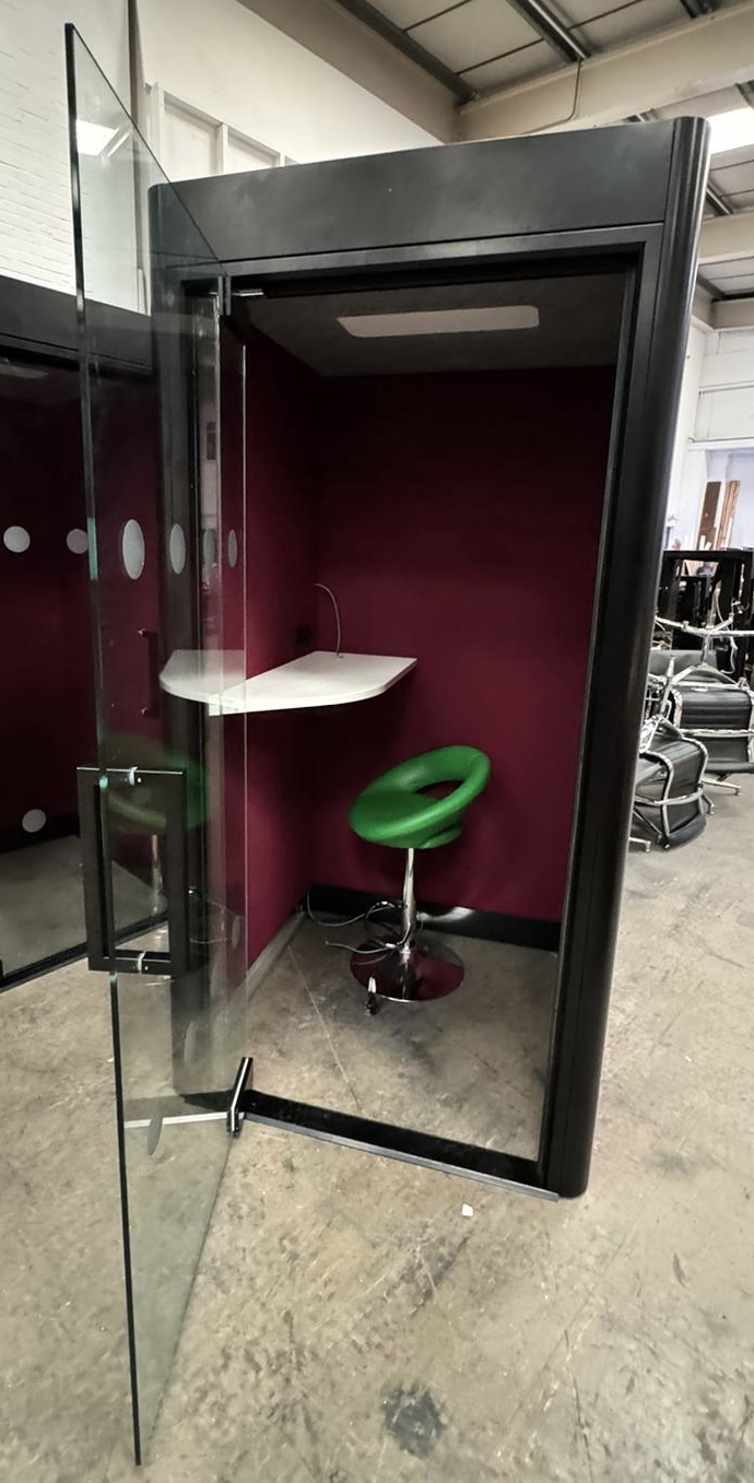 Our Frem Oasis Linear Phone Booth comes with an enclosed ceiling with LED panel, passive infra-red sensor, air circulation fan & acoustic lined panels as standard.