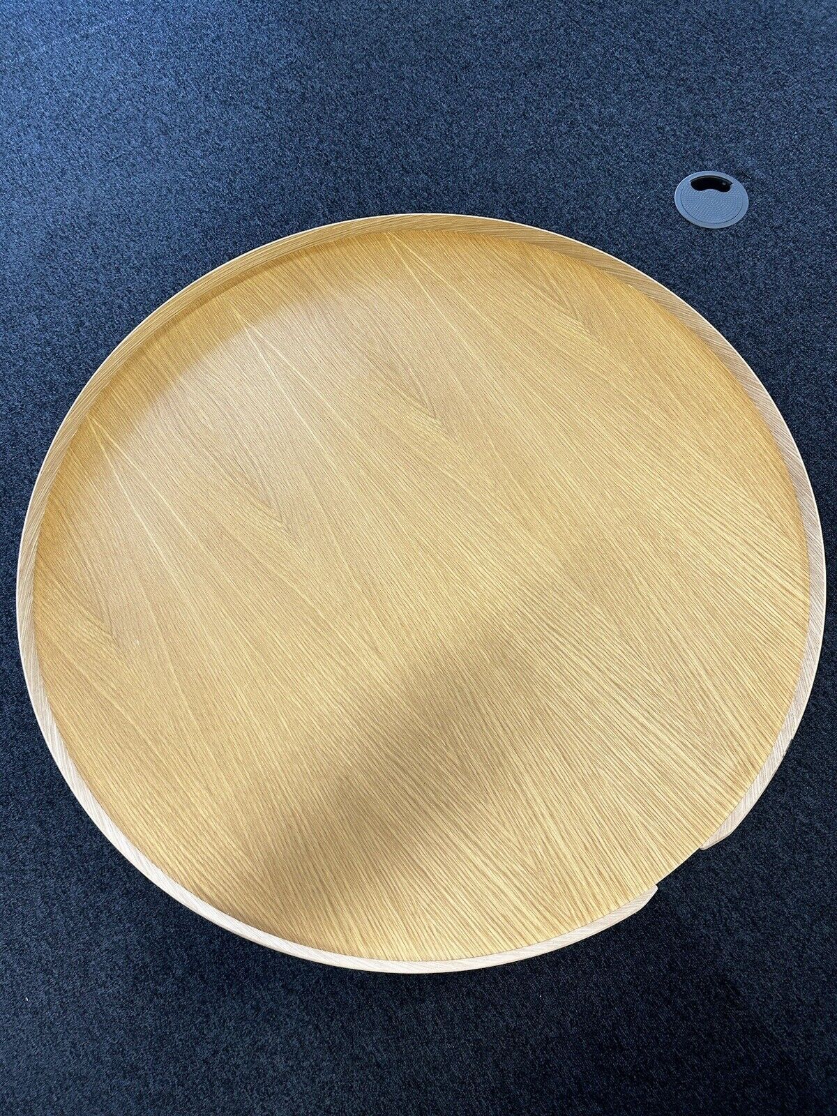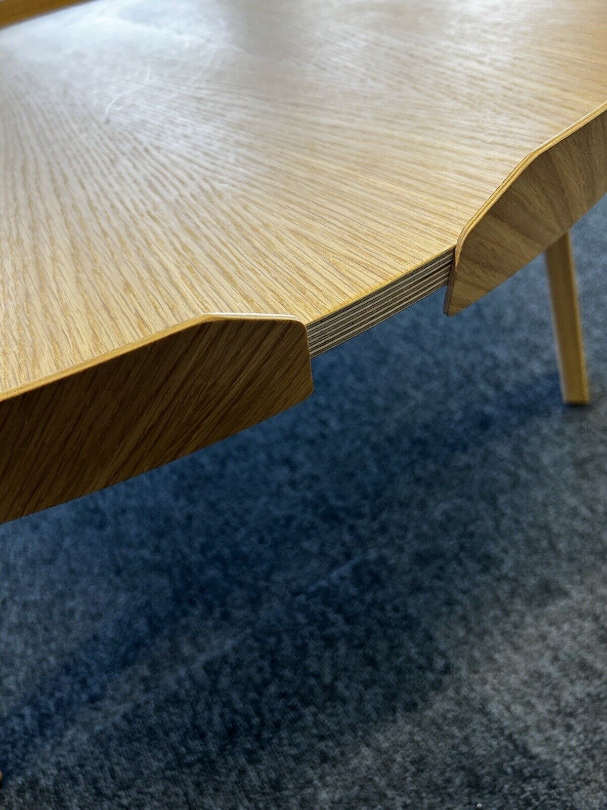 The wood is carefully cut, bent, glued together and polished to create a unique table.