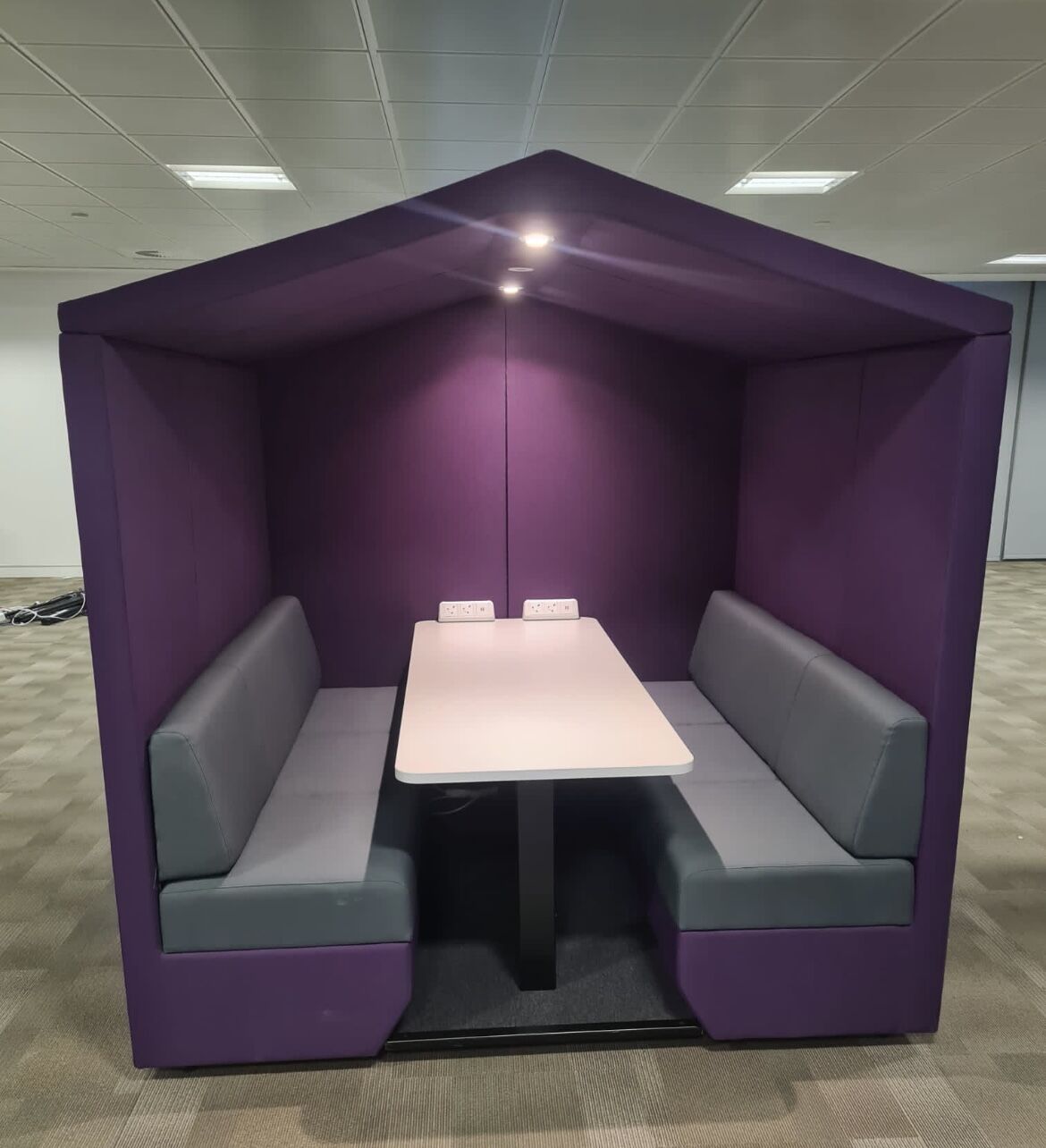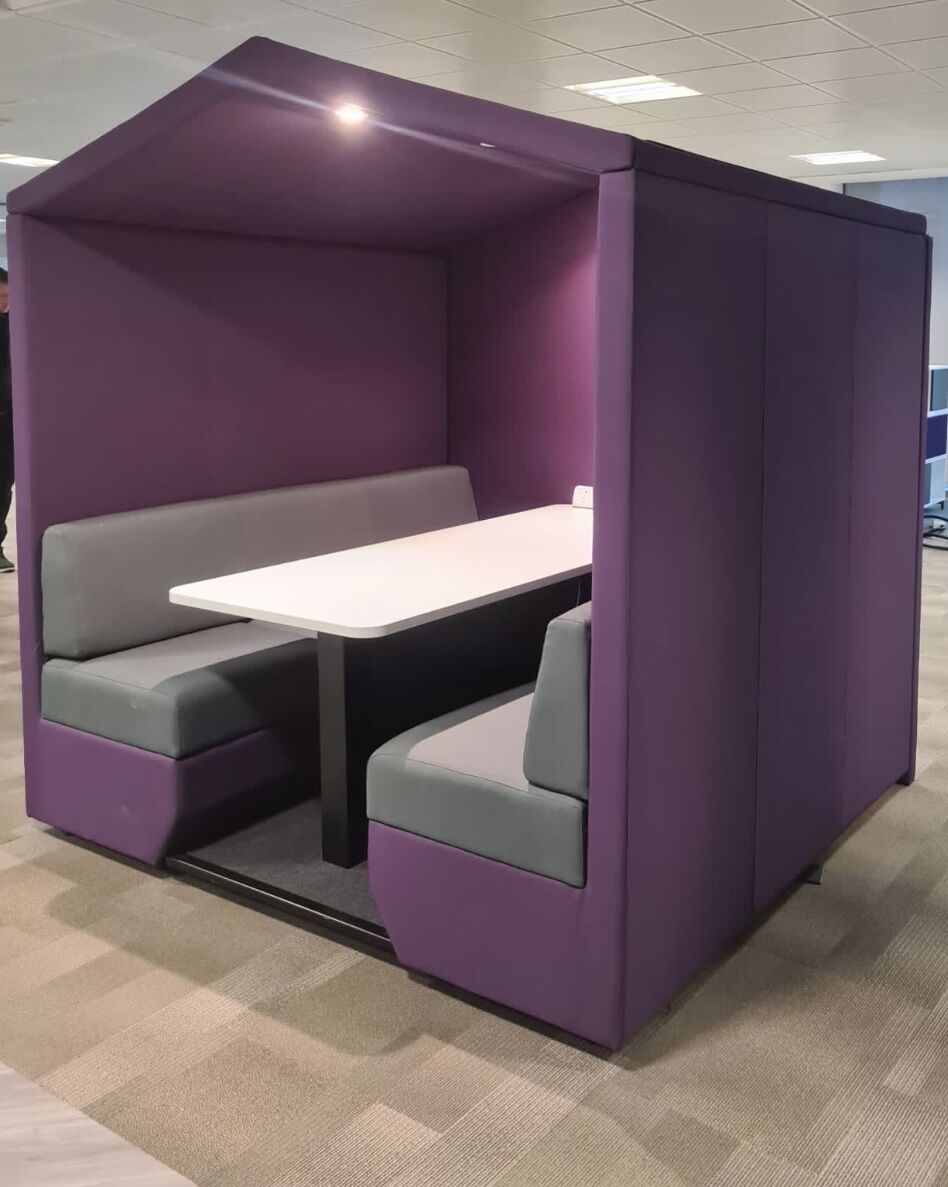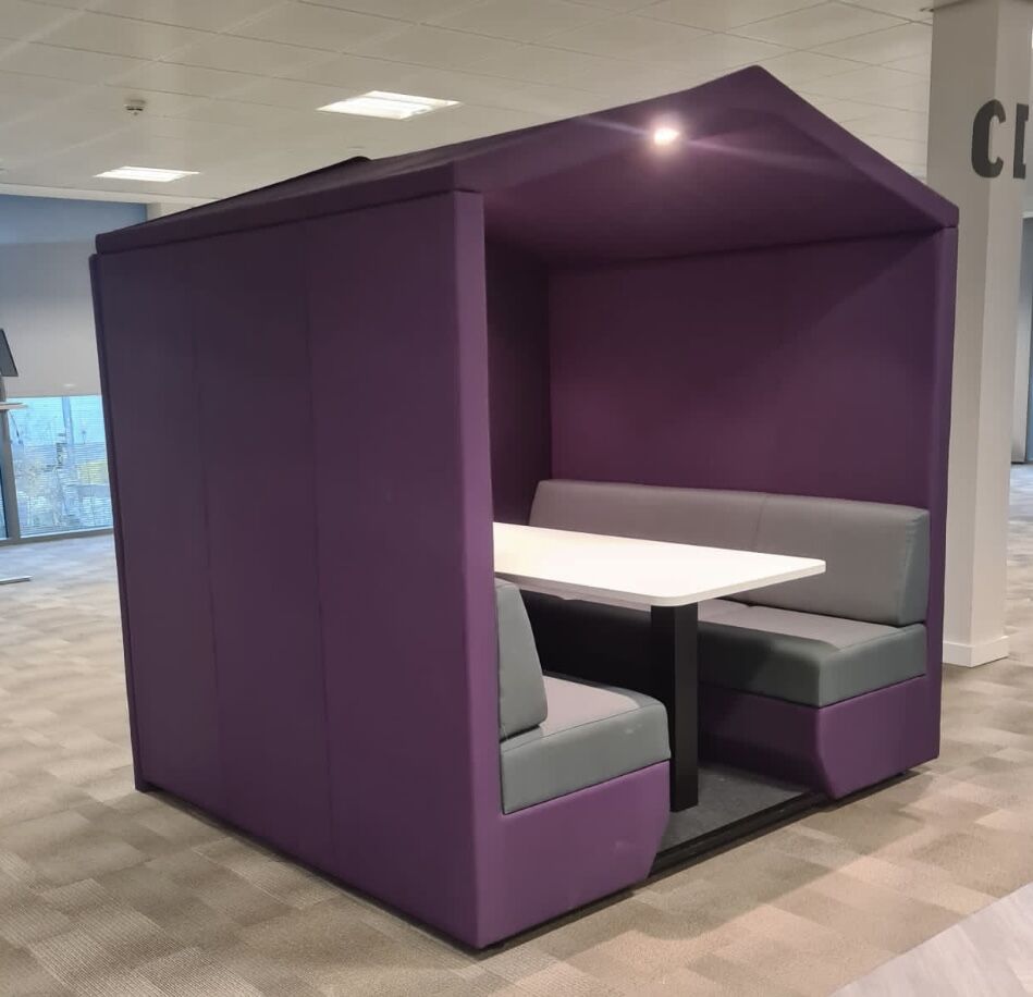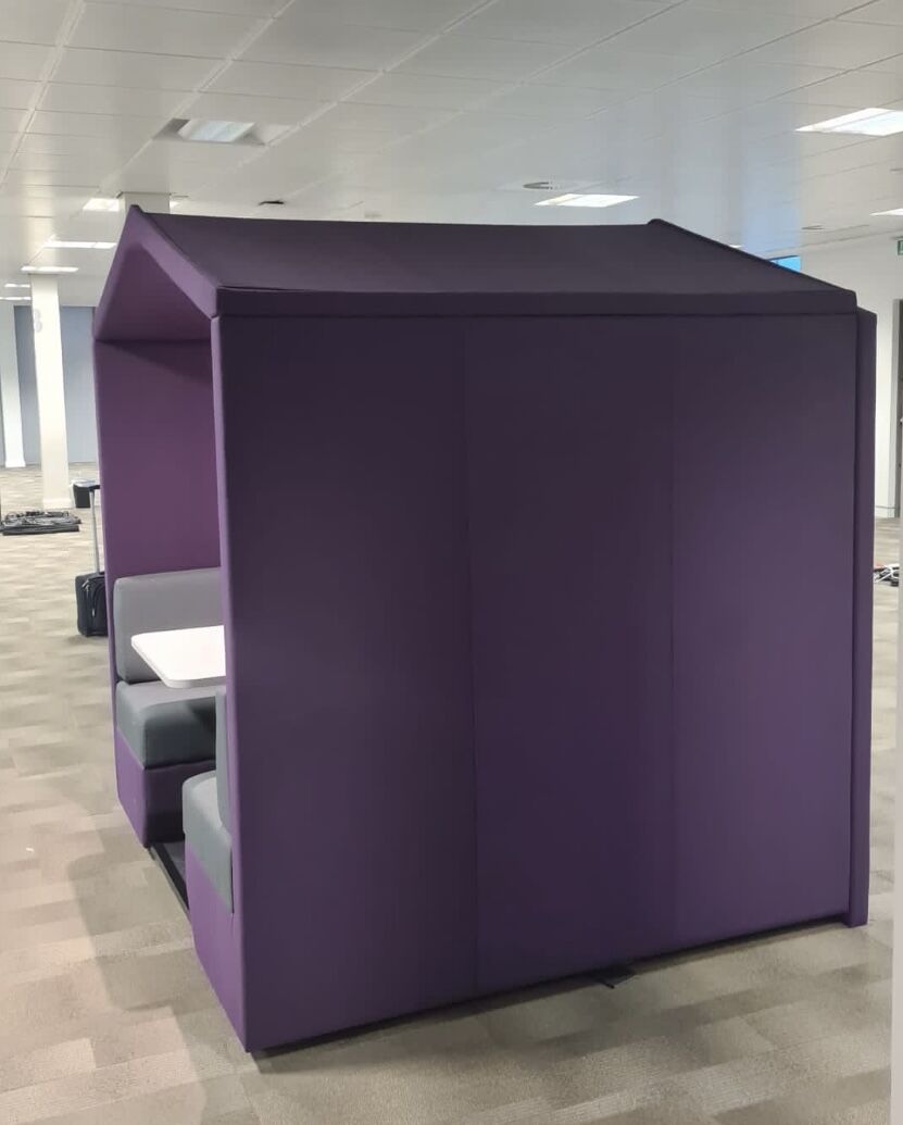 Bea is a fully upholstered office booth with a pitched roof and floor.