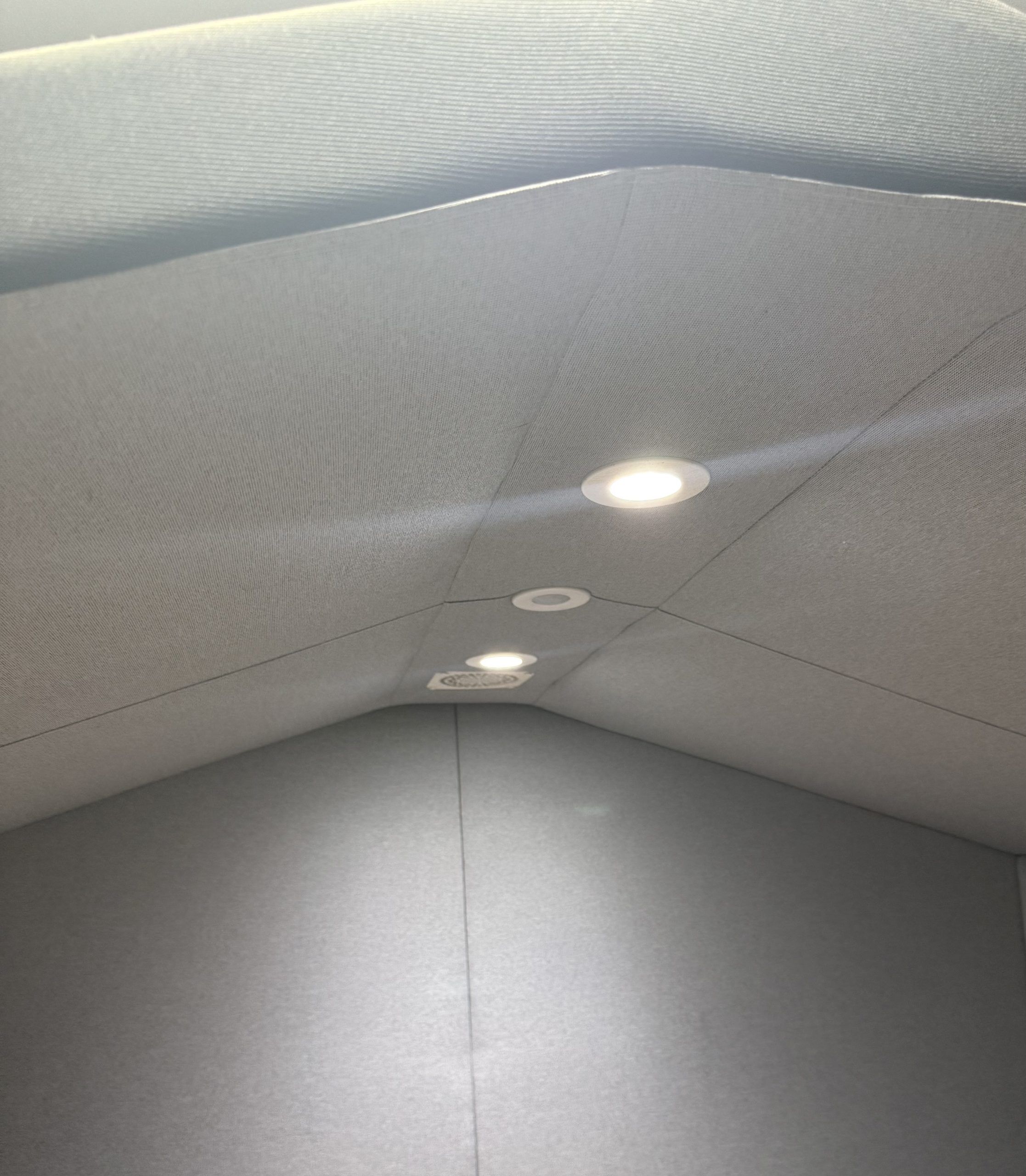 Bea is a fully upholstered office booth with a pitched roof and floor.