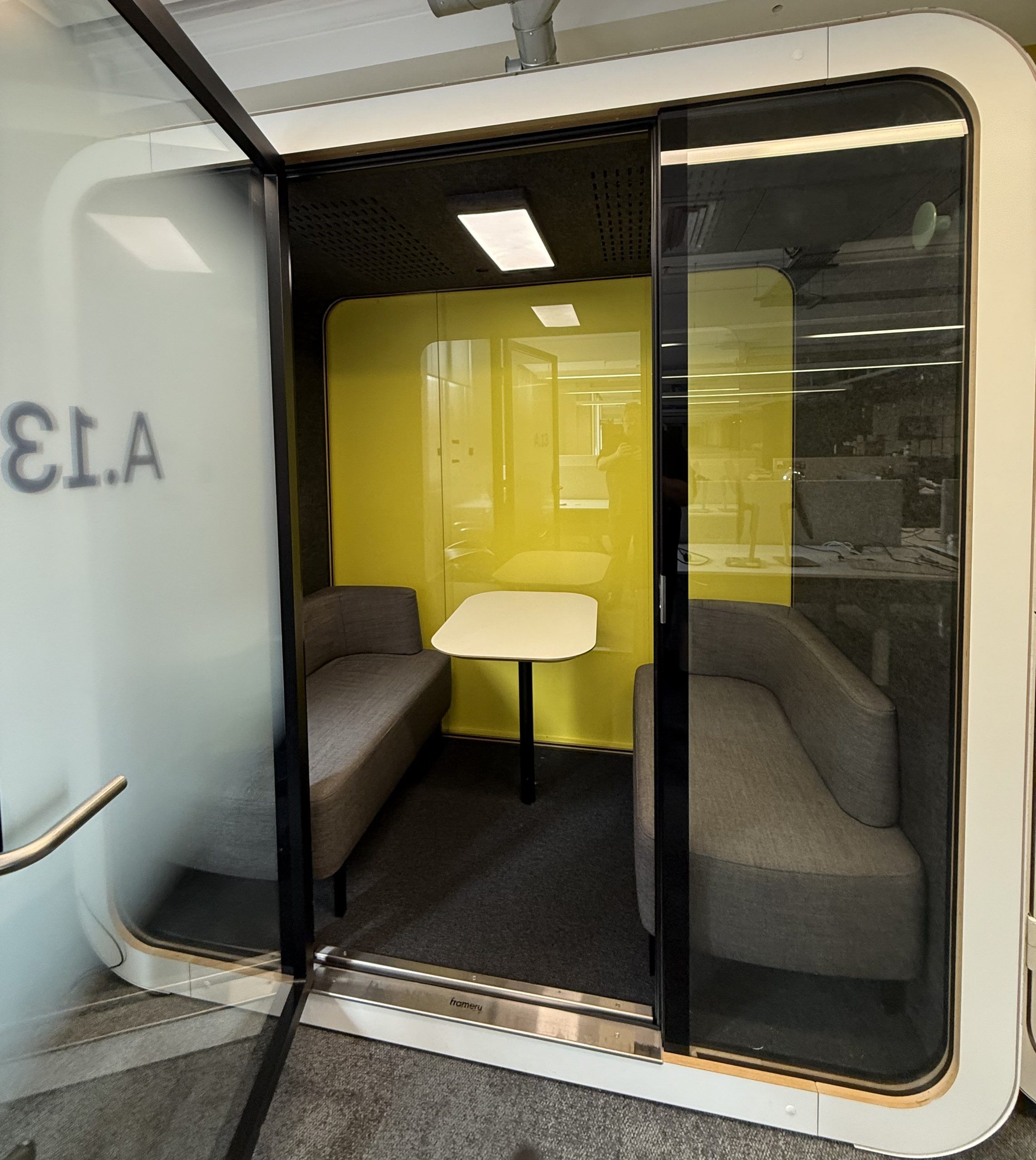 The Framery Q Office Pod is a versatile meeting room which seats up to four people, cosily—and two very comfortably.