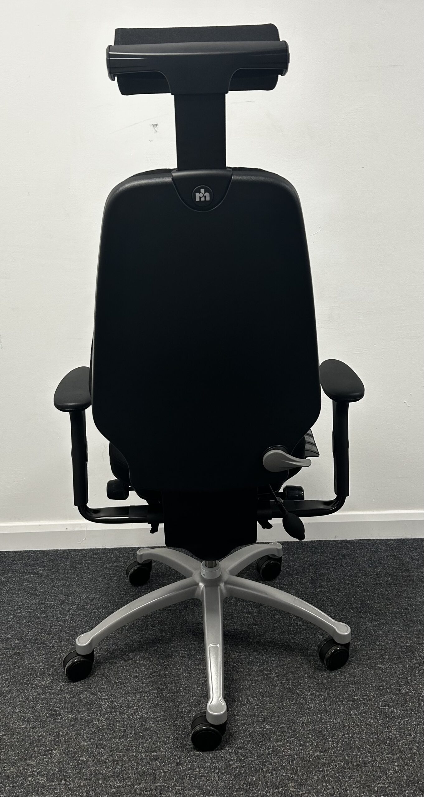 The RH Logic 400 has a high backrest and comes as standard with a lumbar pump, seat slide, castors for carpeted floors, base in graphite aluminium and Black fabric.