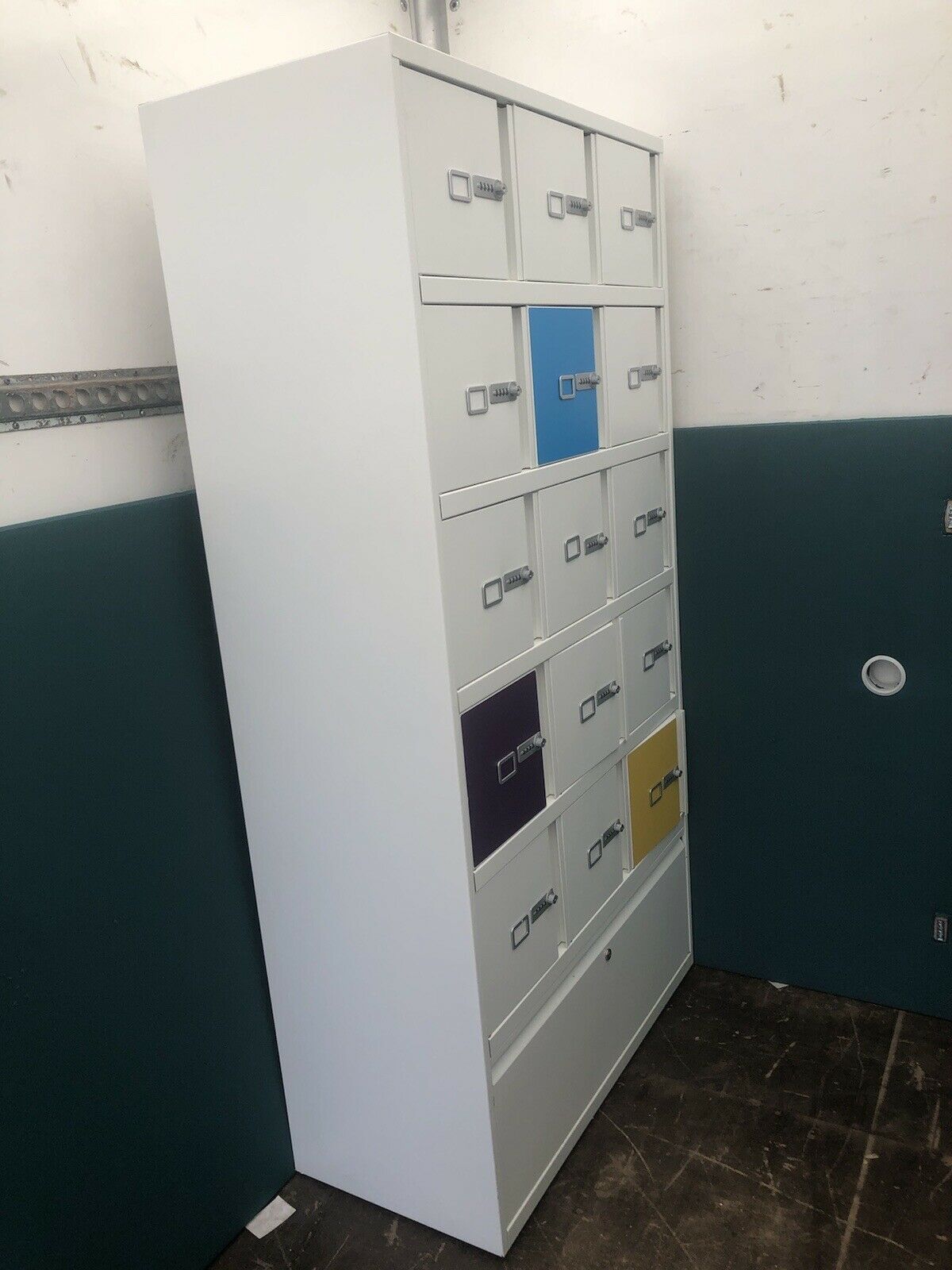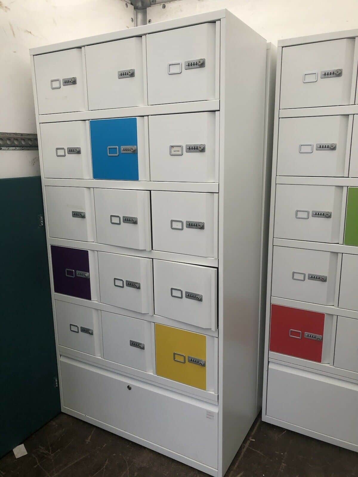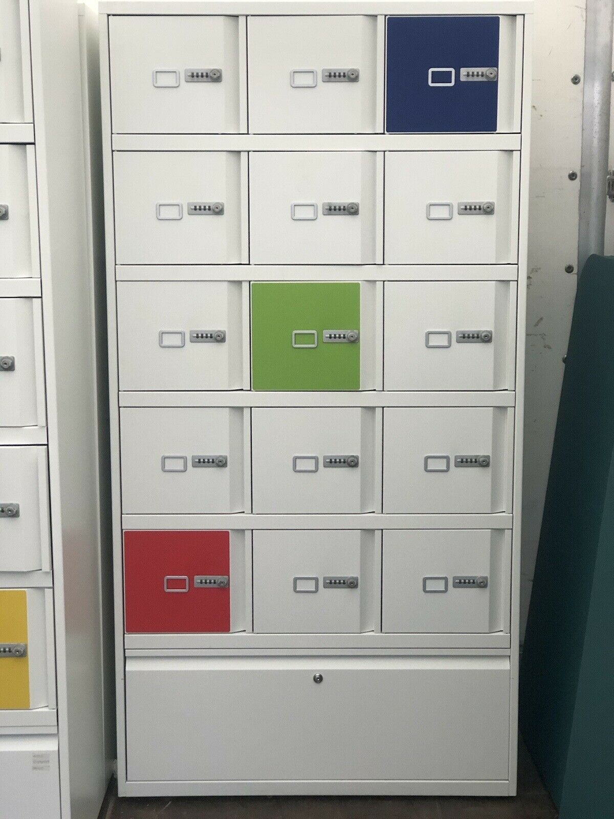 In banks of 15 with one drawer at the bottom of the bank.