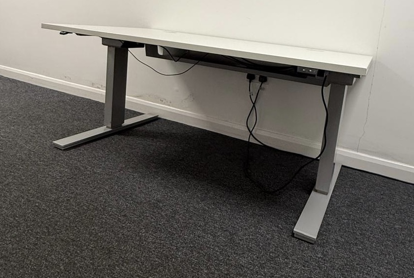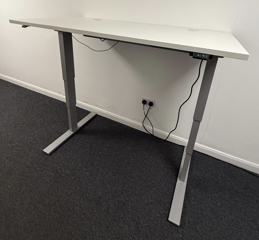 Used Electric Sit Stand Desks with white laminate top on a silver frame. 1400mm x 800mm