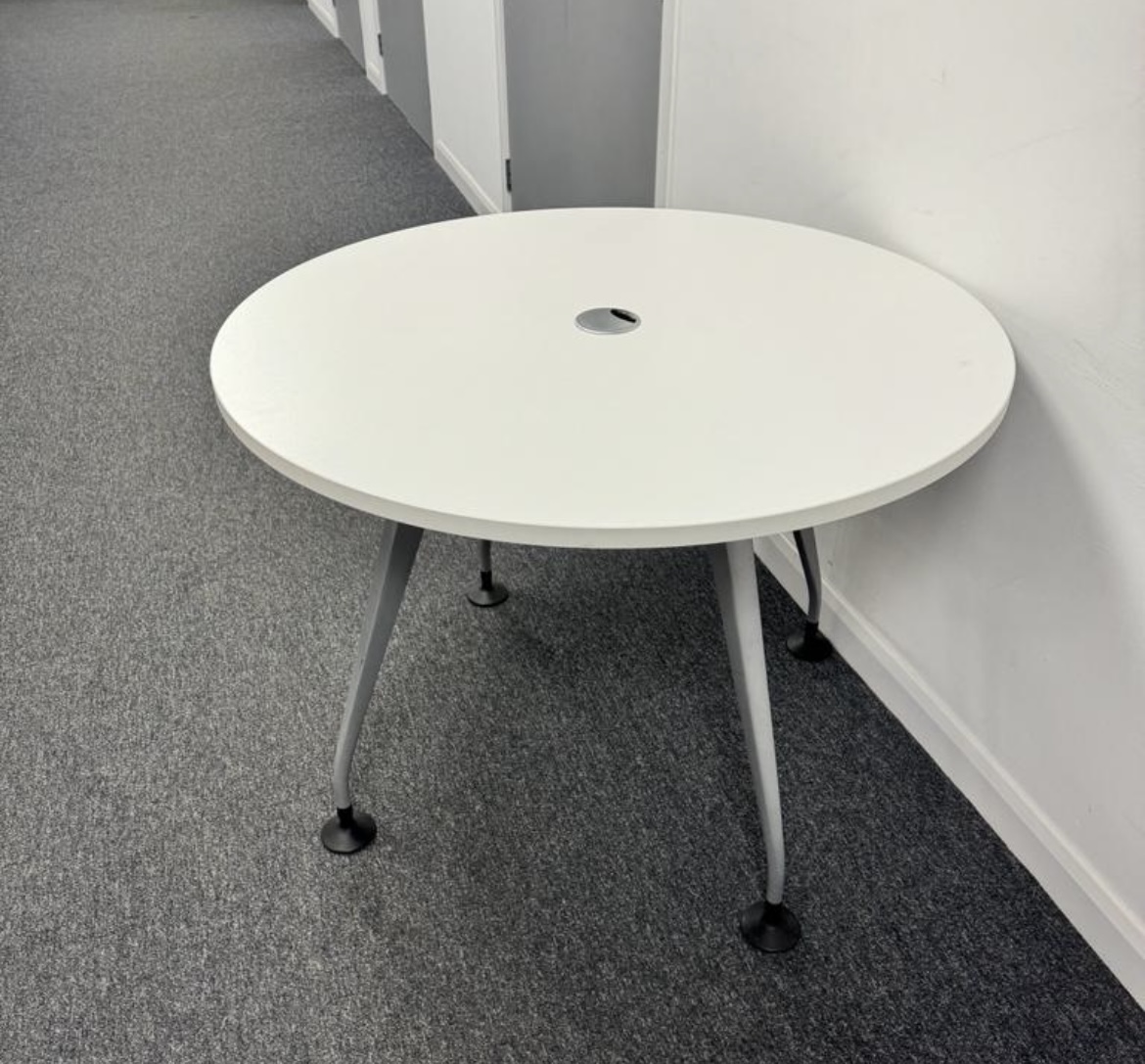 Used Orangebox Pars Round Table 1.0m White Round Laminate Top. Built-in flip-top flush data power port.
